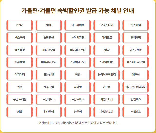 매년 봄·가을·겨울 시즌에 열리며, 특히 가을 시즌은 2025 대한민국가을맞이숙박세일페스타라는 이름으로 불릴 만큼 큰 관심을 받습니다.