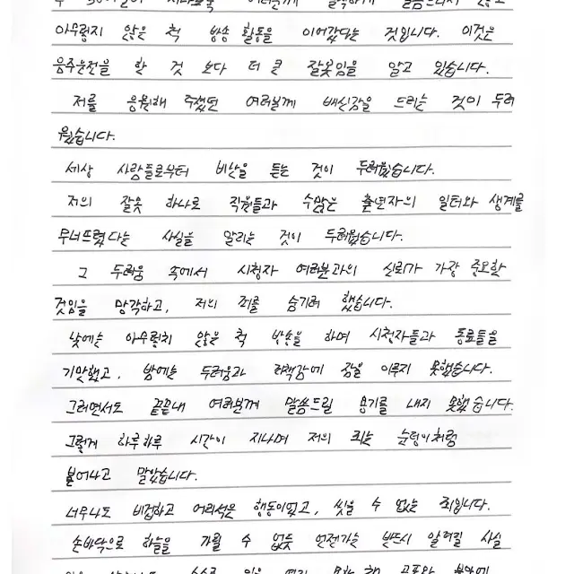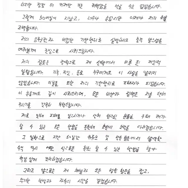 2025년 6월 28일, 홍장원은 혈중알코올농도 0.065% 상태로 귀가 도중 경찰의 음주단속에 적발되었습니다. 이는 2006년 첫 음주운전 이후 두 번째 적발이었기에 충격은 더욱 컸습니다. 그는 8월 18일 유튜브 채널 커뮤니티에 자필 사과문을 공개하며 사실을 알렸습니다. “음주운전은 어떤 변명도 통하지 않는 범죄임에도 다시 저질렀다”며 고개를 숙였고, 특히 50일 동안 적발 사실을 숨기고 방송을 이어간 점을 “더 큰 잘못”이라고 고백했습니다.