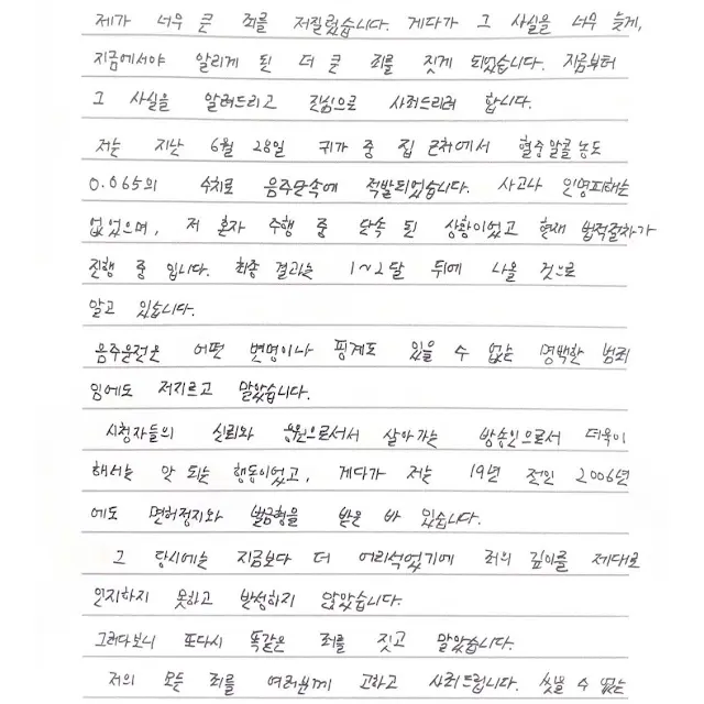 | 주요 이슈 | 2025년 6월 음주운전 적발(혈중알코올농도 0.065), 8월 18일 자필 사과 및 방송 활동 잠정 중단 |